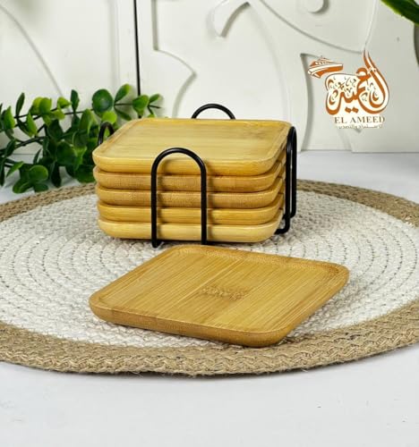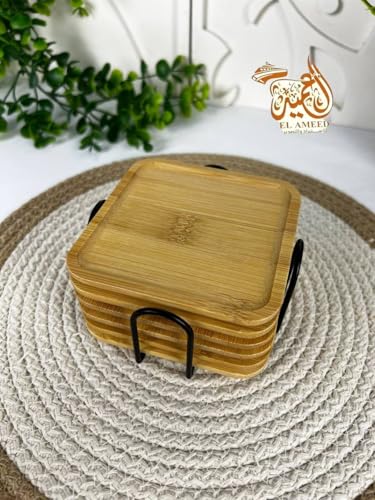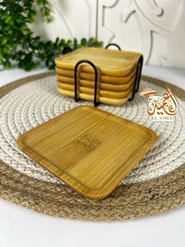 - مجموعة قواعد أكواب خشبية فاخرة: تتضمن 6 قواعد أكواب خشبية مربعة عالية الجودة مصنوعة من الخشب شديد التحمل وحامل معدني مقاوم للصدأ لسهولة التخزين.