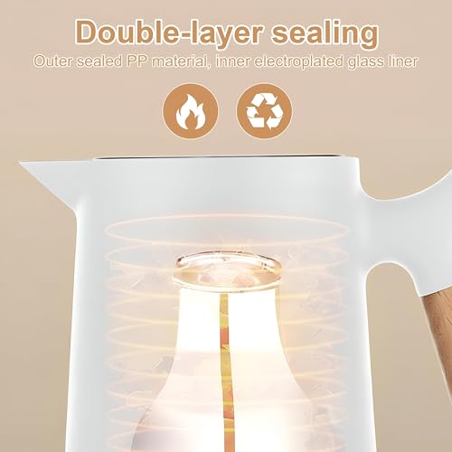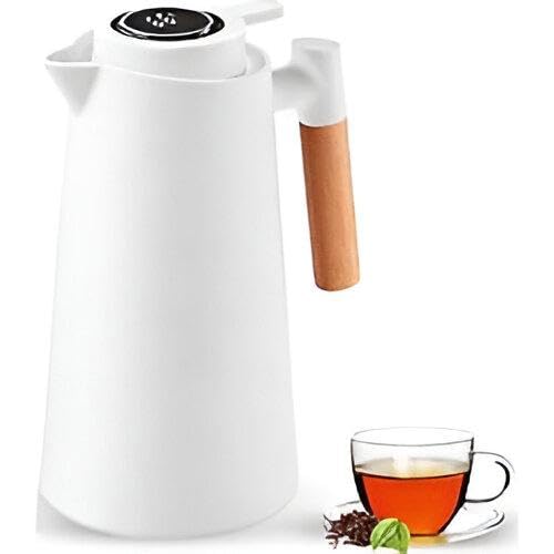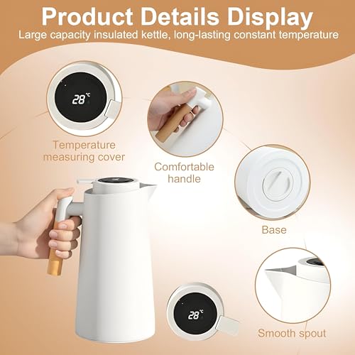 Generic - إبريق بمقبض خشبي 1 لتر مع ظهر زجاجي، مقبض خشبي ناعم، عزل مزدوج الجدار، عرض رقمي لدرجة الحرارة، يحافظ على المشروبات ساخنة أو باردة لمدة تصل إلى 24 ساعة دون فقدان الحرارة، أبيض