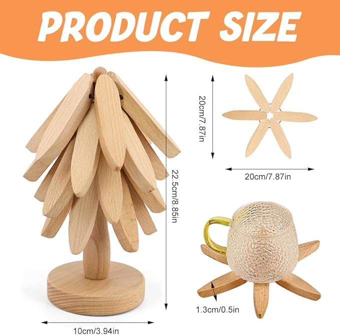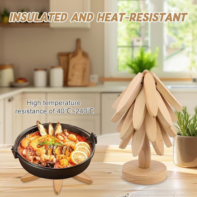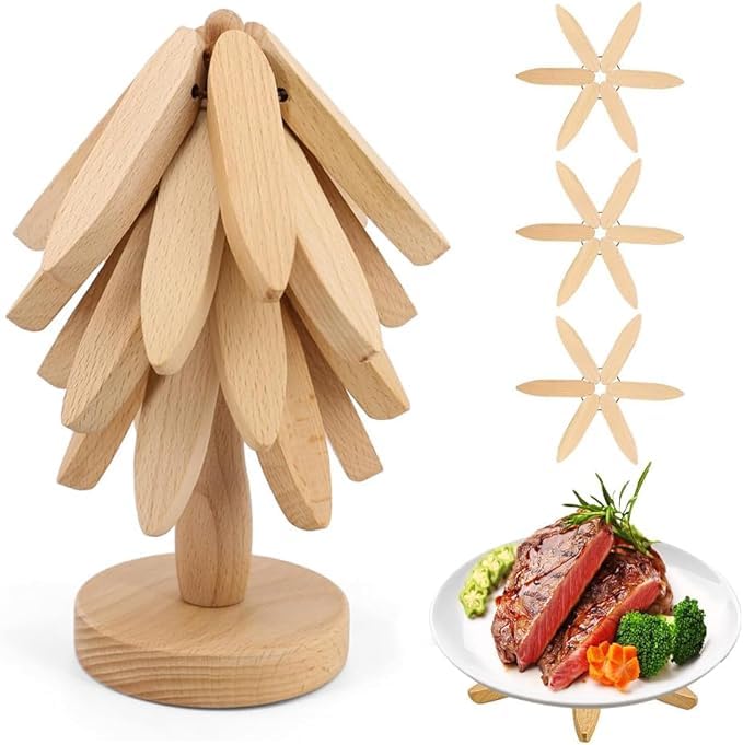 - 1) Design: Creative wooden tree stand with 4 folding trays, perfect for protecting surfaces from hot pots