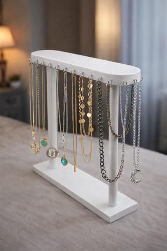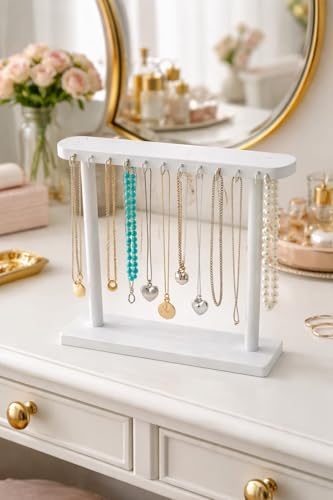 - STYLISH & ORGANIZED DESIGN: Modern white wooden jewelry display stand with sturdy and durable base, perfect for displaying and organizing chains , necklaces and accessories neatly on vanity table