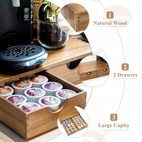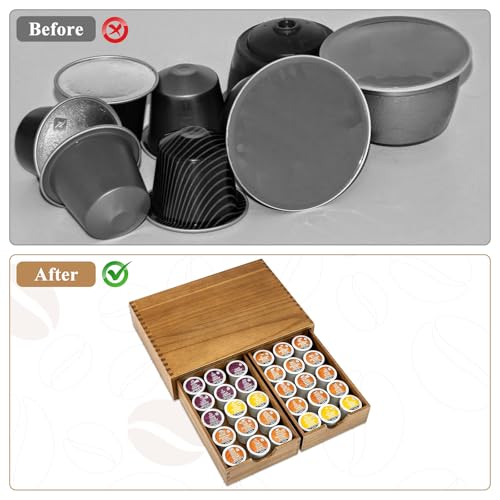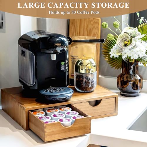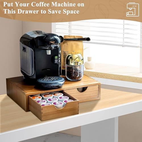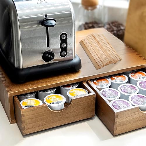 - Natural Solid Wood: Elevate your coffee station with our Wooden K Cup Drawer Organizer. Crafted from natural wood, it boasts a beautiful wood grain that adds a touch of class to your kitchen. This coffee bar organizer not only stores coffee pods but also complements your coffee maker, making it a great addition to any coffee lover's home