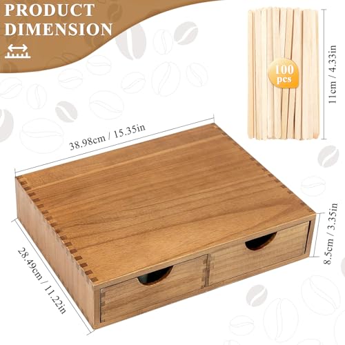 FACULX - Wooden K Cup Drawer Organizer Storage with 100 Pcs Wood Coffee Stirrers, Multi-Functional Desk Organizer Drawers for Coffee Maker Machine Stand, 30-Pod Capacity