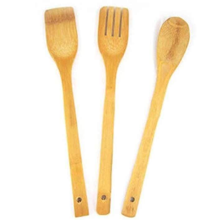 - VERSATILE SET: Complete 3-piece wooden kitchen utensil set includes a spatula, slotted spoon, and serving spoon for all your cooking needs
