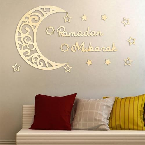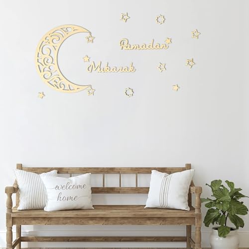 Generic - Wooden Ramadan Wall Decoration Set, Gold, 15 Pieces with Crescent Moon and Stars, Double-Sided Stickers, 28cm Crescent, Islamic Home Decor