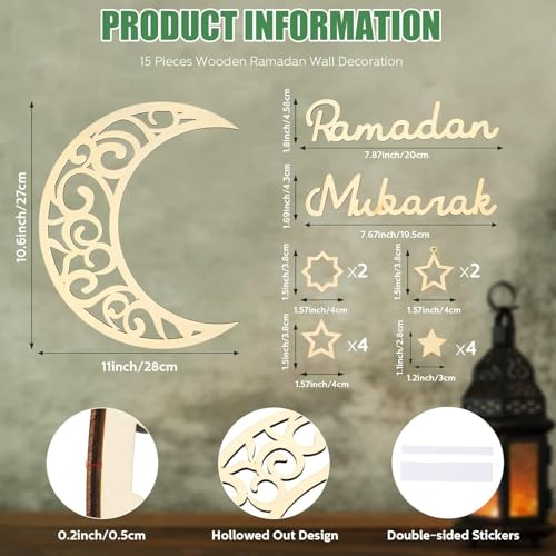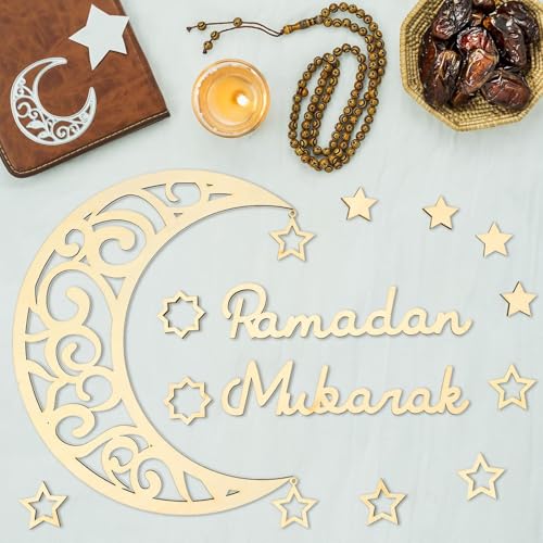 - COMPLETE SET: 15-piece Ramadan decoration set includes a 28cm ornate crescent moon, 'Ramadan Mubarak' text pieces, and multiple decorative stars in various sizes