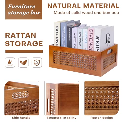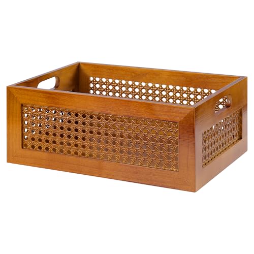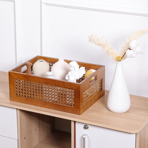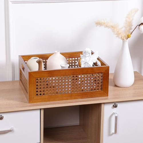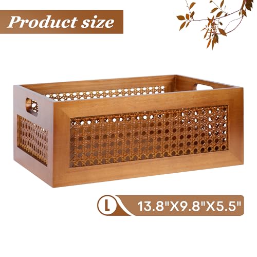 LaMorée - Wooden Storage Basket Handmade Rattan Drawer Storage Box with Frame & Handles Decorative Natural Bamboo Woven Bins Rustic Farmhouse Decor Home Office Tabletop Shelf Organizer 13.8" x 9.8" x 5.5"