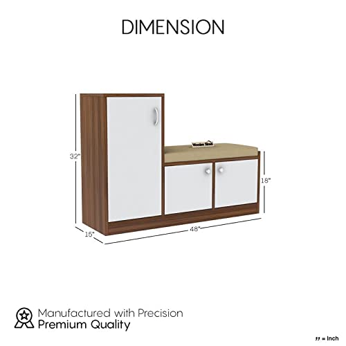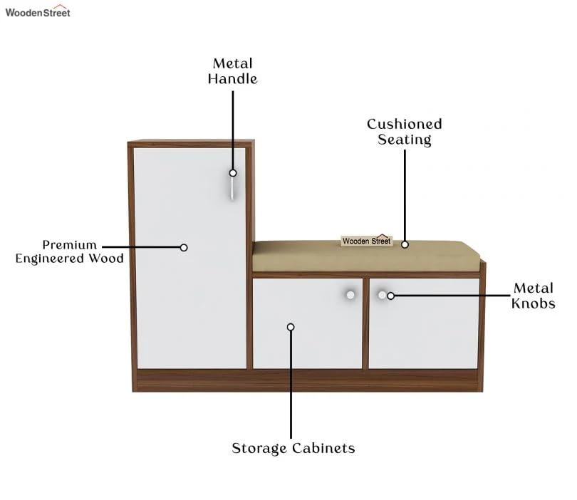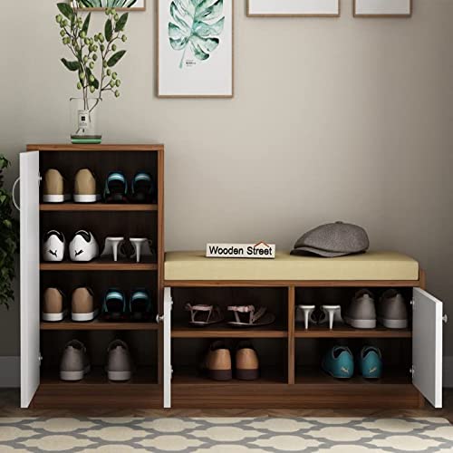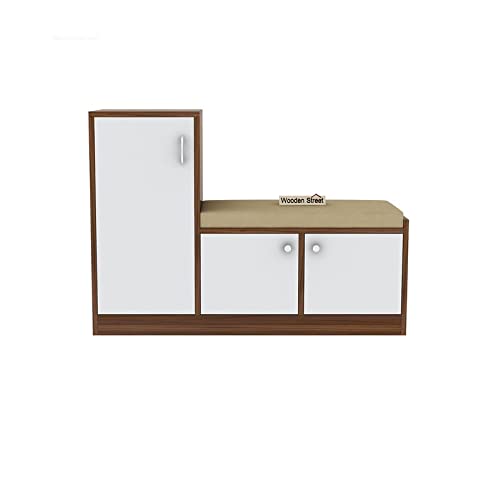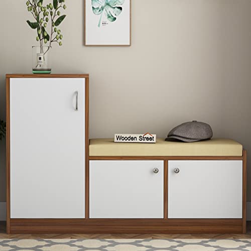 Wooden Street - Wooden Street Engineered Wood Exotic Teak & Frosty White Finish Caspian Shoe Rack Cabinet Multipurpose Rack for Home & Office with 3 Doors, 8 Shelves, Cushion Seat