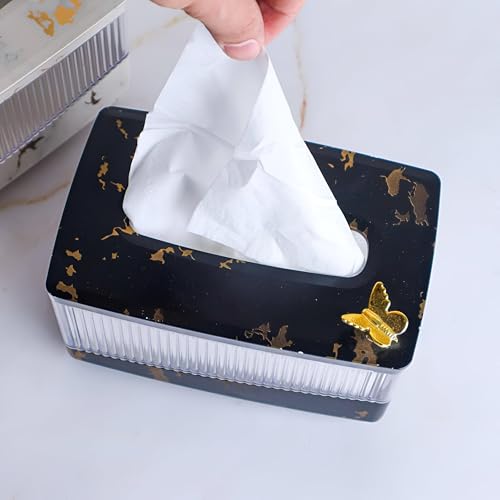 - This rectangular tissue box cover offers a refined combination of function and style. Crafted from thick, high‑quality PET material blended with durable ABS and stainless steel details, it resists wear, falls, and everyday use while maintaining a smooth, luxury texture. The transparent body enhances the visual appeal of any décor, from modern office desks to elegant vanity tables.