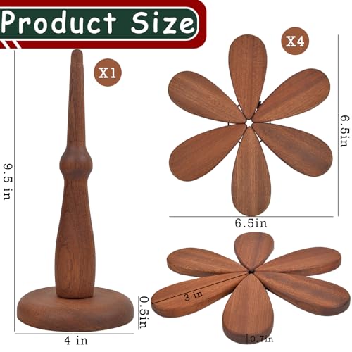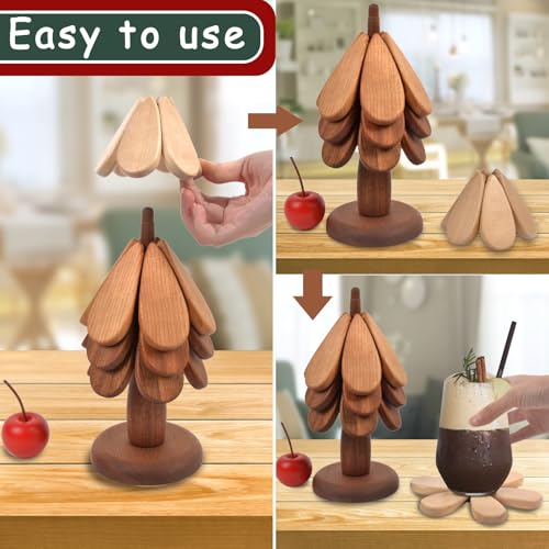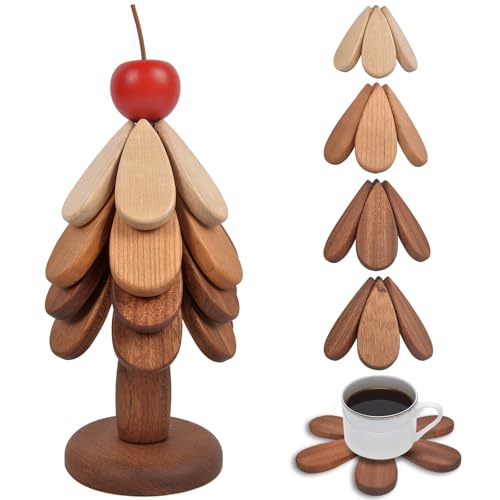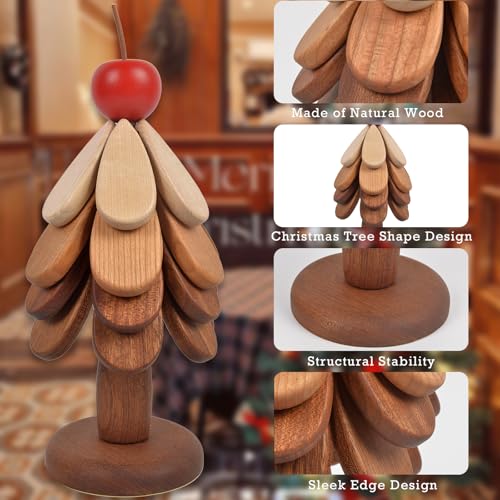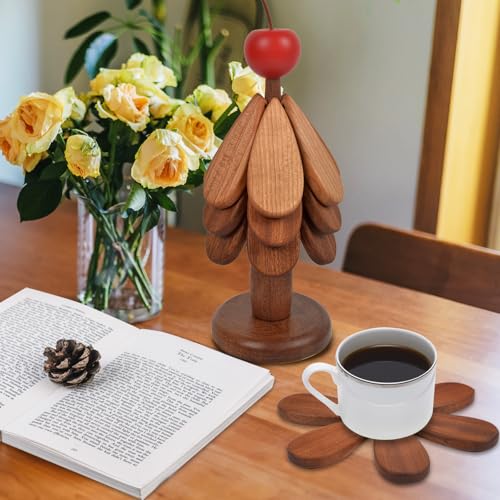 - 4 Pcs Wooden Trivets for Hot Dishes - This wooden trivet set for hot dishes includes 4 trivets and 1 bracket, featuring a charming cherry decoration, to protect your countertops and tabletops from heat. Handmade from black walnut, this wooden tree trivet set brings a touch of nature to your kitchen, adding a warm, decorative touch—just like a Christmas tree.