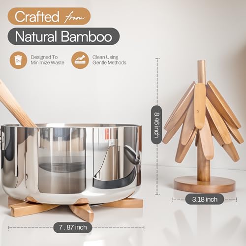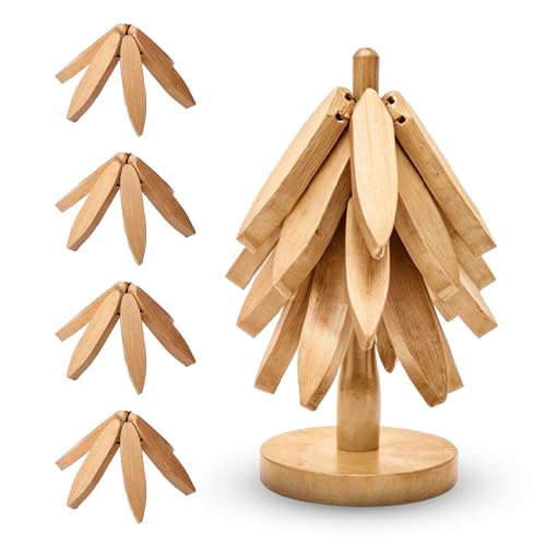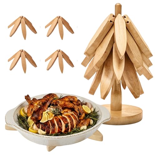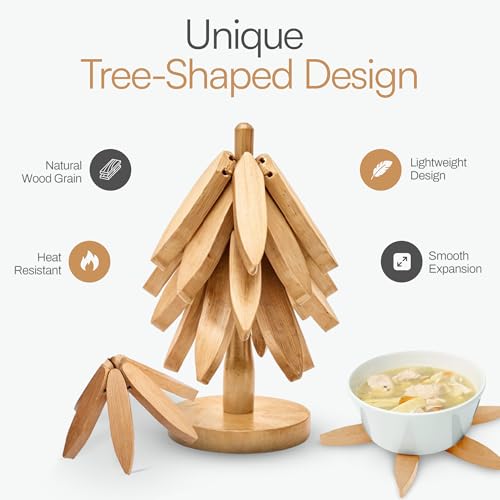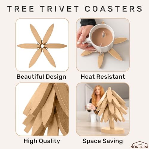 NORDORA - Wooden Tree Trivet Set – 4 Tree-Shaped Coasters & 1 Stand for Hot Pots, Dishes | Heat-Resistant, Space-Saving Pot Rest & Cozy Kitchen Decor, Tree Trivets for Counter + Special Bonus (Beech)
