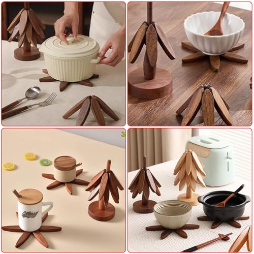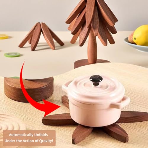 - SMART DESIGN Each trivet for hot food is made of a wooden tripod, so you can take one out directly and place it on the countertop. You don't need to unfold it manually, just put the harness slowly on it and it will automatically unfold with the effect of gravity