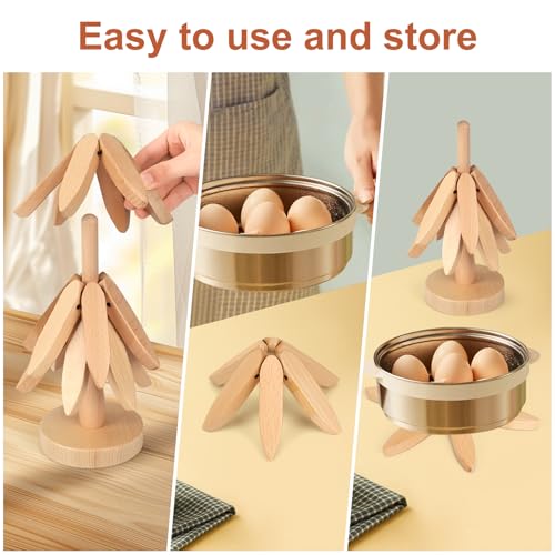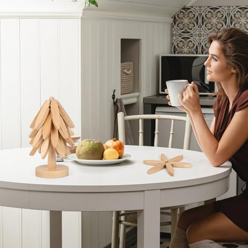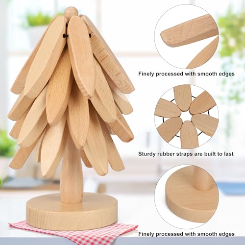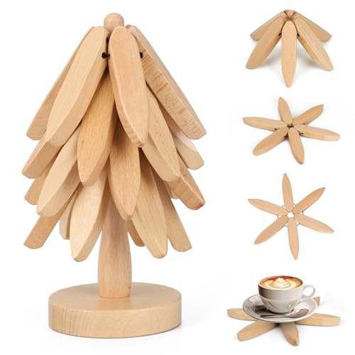 Mailirious - Wooden Trivets for Hot Dishes, Tree Shape Trivet Set, Foldable Kitchen Wooden Tree Coasters, 4 Wooden Trivets + 1 Stand, Wooden Trivets for Hot Pot, Pans, Bowl and Teapot (Beech Wood)