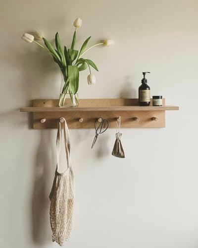 Generic - Wooden Wall Shelf with Hooks,55 × 15 × 12 cm, Natural Wood Finish, Storage Rack with Display Top