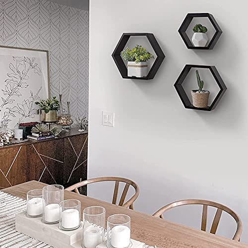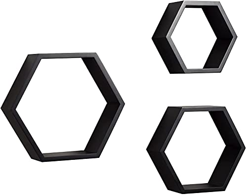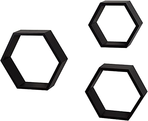 Wooden World - Wooden World Floating Shelves Wall Mounted Set of 3 Hexagonal Shelves, Wood Farmhouse Storage Honeycomb Wall Shelf, Hexagon Wall Shelves for Living Room. (White) (Black)