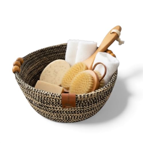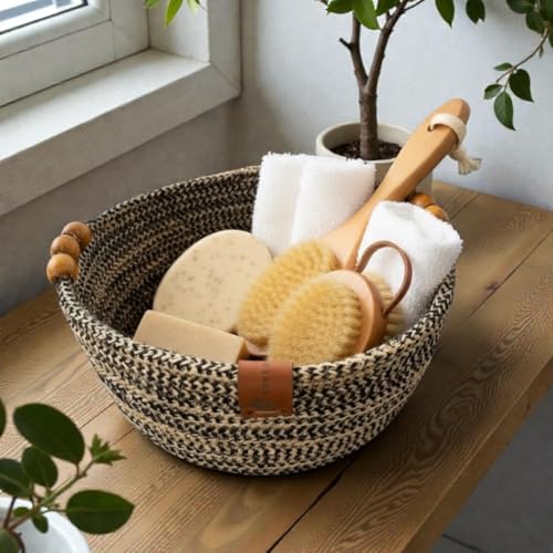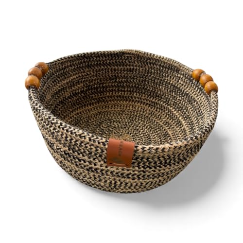 Woven it - Cotton Basket black & beige with wood decor 20cm x 10cm, storage basket, and organizer.Can be used in Kitchen, Dining Room,Living room,Bed room,Kids Room, Bathroom, Indoor & outdoor.