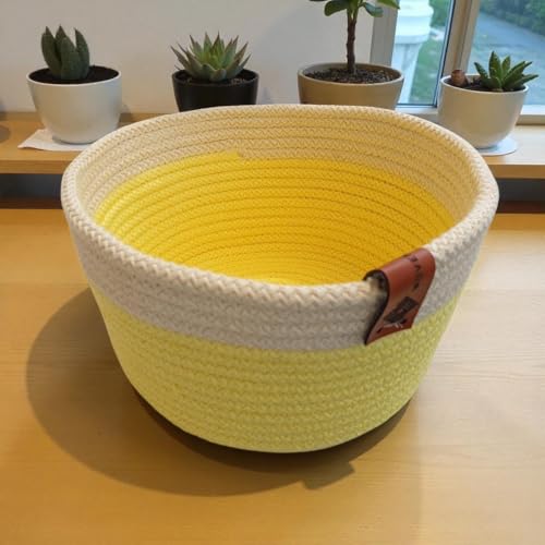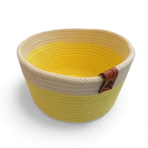 Woven it - Handmade Cotton round Yellow & White Basket 20cm x 10cm, can be used in Kitchen, toilet, bedroom, kids room, living room, dining room, inside and outside.