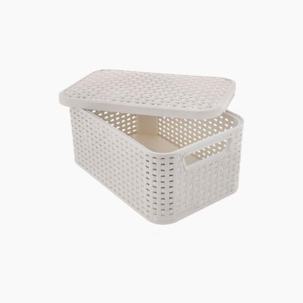 - VERSATILE DESIGN: Plastic storage basket with rattan-style weave pattern and convenient lid, perfect for organizing household items in style