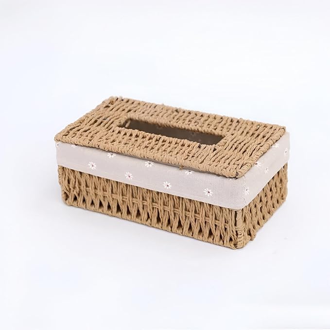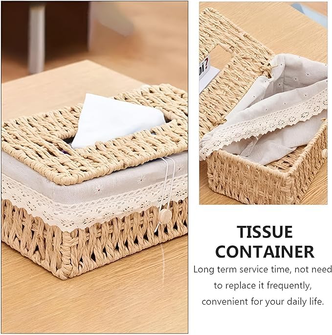 - This woven fabric box is beautifully designed in a rustic rectangular retro style, specially formulated for storing facial tissues. Its versatile use makes it perfect not only for home use but also seamlessly fits in office and car environments adding an aesthetic charm wherever it is placed. Quality craftsmanship ensures that it stands out as a functional piece of decoration while serving its primary purpose.