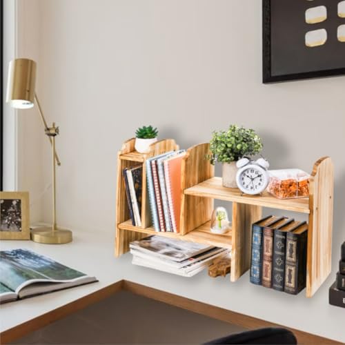 - Expandable Desk Organizer: The desktop bookcase is composed of two main parts, which can be close to be a small shelf rack, or further apart to be a longer shelf, meets your different storage needs.