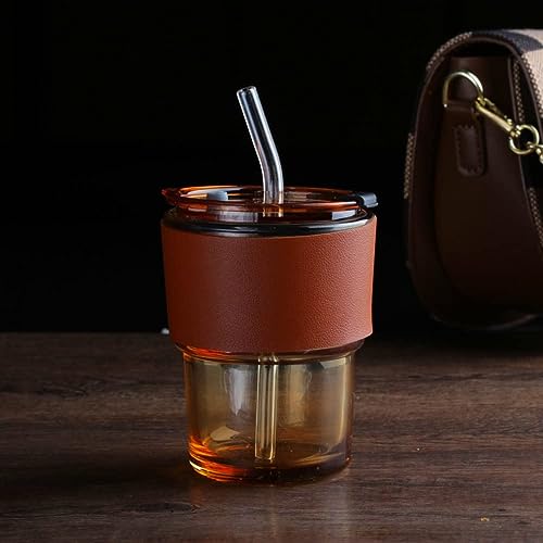 Wsaikis - Glass Reusable Coffee Mug with Heat Resistant Leather Wrap Glass Water Cup with Glass Straw and Leakproof Lid Glass Tumbler for Coffee,Tea, Milk Beverages 14oz (Amber)