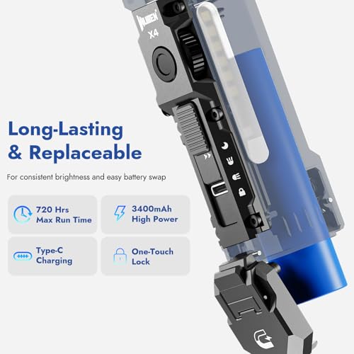 - Long Battery Life & Battery Indicator: The X4 small flashlight has a battery life of up to 285 hours, and its 3350mAh high-capacity battery can be fully charged in just 2.5 hours. It also features a battery indicator function, allowing you to monitor the battery level at any time