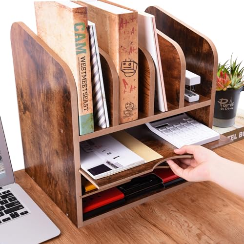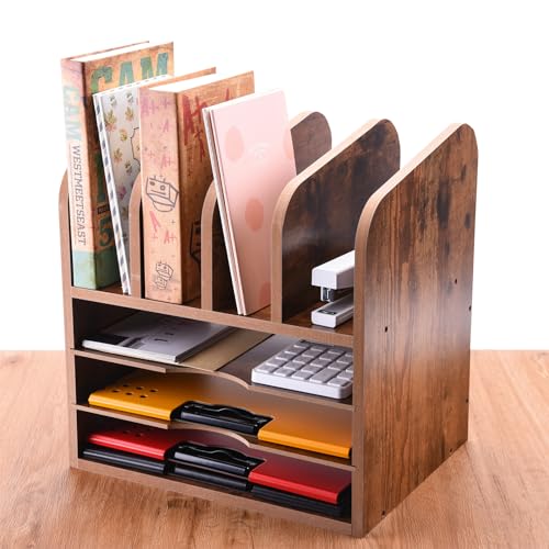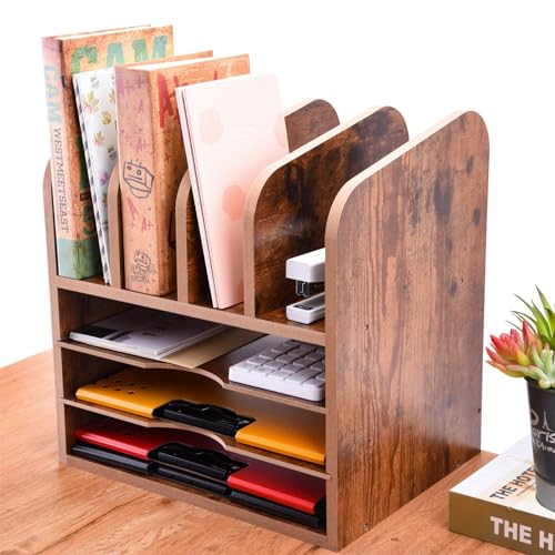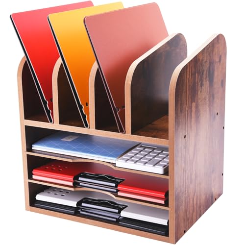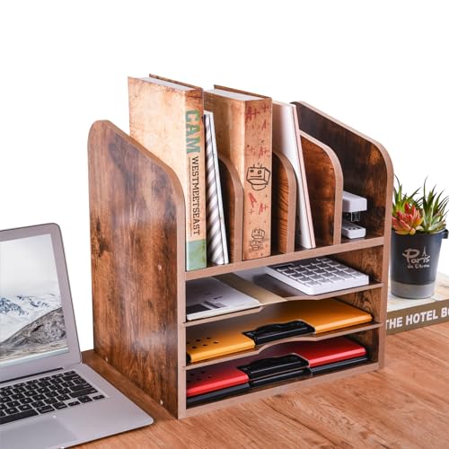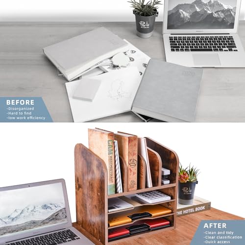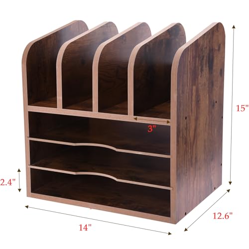 WuGeShop - WuGeShop 3 Tier Wood Paper Letter Tray with 4 Vertical File Holders, Rustic Desktop File Organizer Paper Organizer and 4 Upright Sections, Desk Organizers and Accessories for Home Office School, Brown