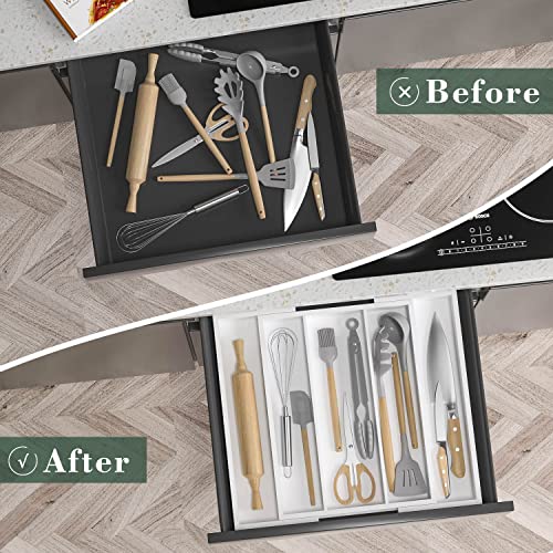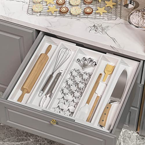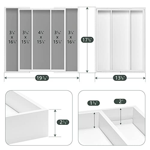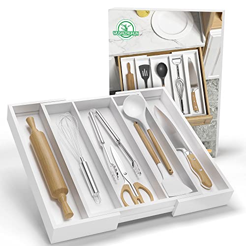 WUSHIZHUHUN - Utensil Organizer for Kitchen Drawers - Bamboo Silverware Tray Expandable 5 Slots Drawer Organizer for Office and Pantry Supplies W13.7-19.9" x L17.6 X H2.5 (White)