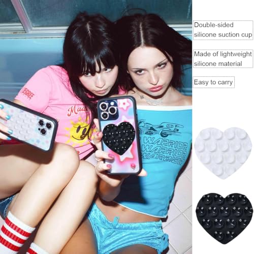 WUSJCOF - Double Sided Suction Cup Phone Holder, Heart-Shape, Multi-purpose Silicone, Soft Phone Case, Sticky Phone Grip for Mobile Devices, iPhone (Black/White)