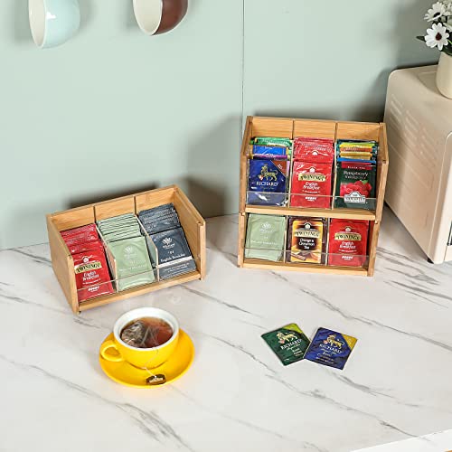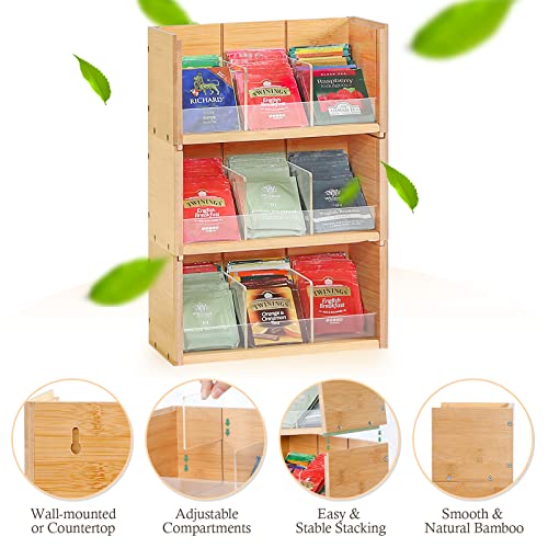 - 【Adjustable Compartments】The tea bag holder features 3 layers, each with 3 individual storage sections for a total of 9 adjustable compartments. Each divider wall can be easily removed for custom compartment sizes. No need to worry about different sizes of tea bags.