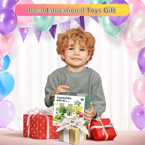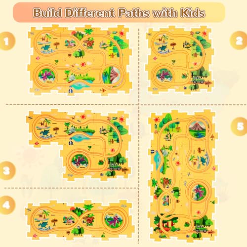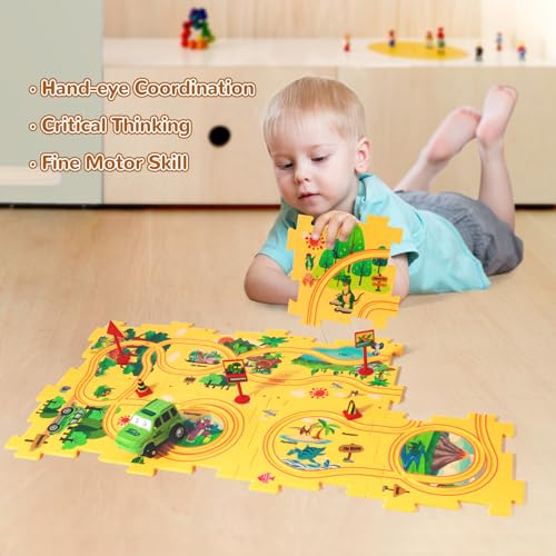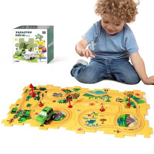 XAZASTOV - مجموعة مضمار سيارة بازل ديناصور للاطفال من سن 3-5 سنوات مع مركبات واحجية سيارة سكك حديدية ومسارات سيارات للاطفال الصغار، هدايا العاب للاولاد بعمر 2 3 4 5 6 سنوات، العاب مونتيسوري من زازاستوف