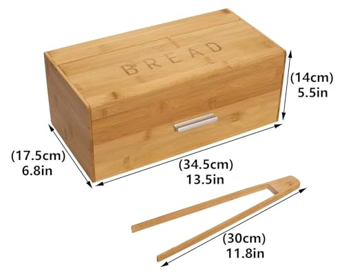 - 5. Bread Container Dimension: This wooden bread storage box is a vintage addition to any kitchen counter. The size is 34.5 x 17.5 x 14cm / 13.5 x 6.8 x 5.5 inches, it can hold 2 loaf normal size bread, rolls, muffins and more, which will avoid effectively deformation of bread caused by extrusion.