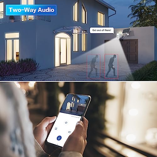 - 【Smart Detection and 2-Way Talk】The smart home security camera features an updated PIR motion sensor and AI algorithms, supports smart human/animal detection. Once triggered, the security camera will auto record event, push a real-time app notification. You could turn on the spotlight or sound to make an alarm via the APP, talk and alerts uninvited guest with built-in mic and speaker.