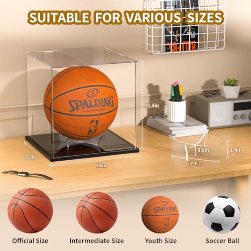 - Size: Measuring 11x11x11.4 inch (28x28x29cm), this ball display case is ideal for full-size basketballs, Also, you can use it to store and showcase soccer balls, volleyballs, or any other collectible balls. Whether it’s a autographed standard NBA basketball or a game-winning soccer ball, this basketball stand display is the perfect fit for your collection