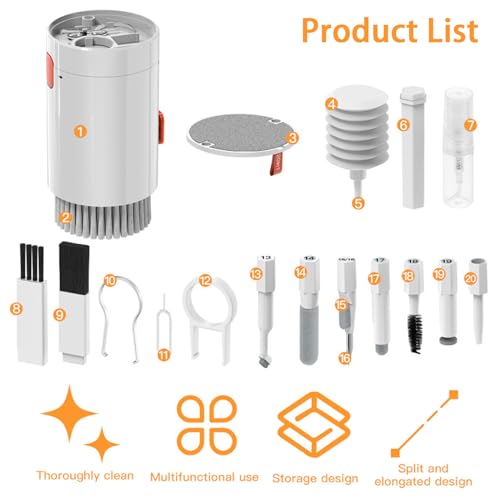 - 20 in 1 keyboard cleaning kit: the keyboard cleaning kit offers 20 types of cleaning tools, including cleaning cloth, cleaning fluid, brush, air blower, needle removal card, cleaning pen tip, etc., which are able to thoroughly clean the surfaces, screens, lenses and other parts of Bluetooth headsets, mobile phones, cameras, lenses, keyboards and other devices.