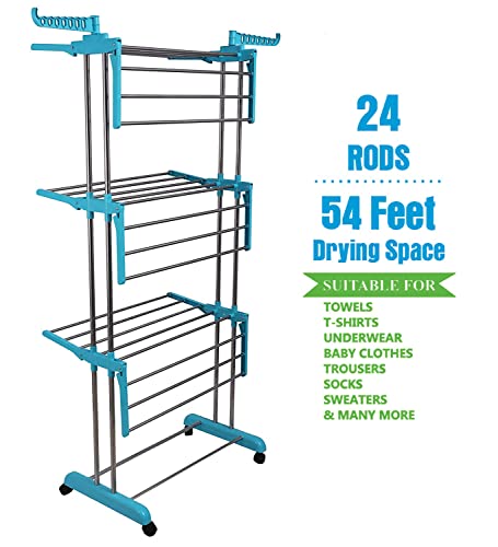 - COLLAPSIBLE AND MOVABLE CLOTH DRYING STAND [Huge 54 feet Drying Space]: The cloth drying stand is a 3-layered jumbo double pole rack with 6 folding wings and 24 sturdy rods. The foldable wings help in saving space which is perfect for small spaces. Besides, it has enough space between the rods for a quick air dry and is equipped with 4 upgraded castor wheels which move 360 degrees for its easy movement outside or inside.