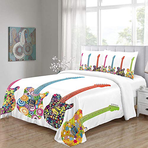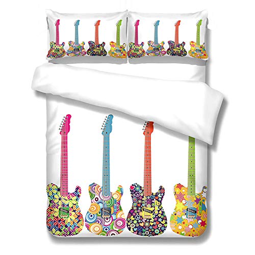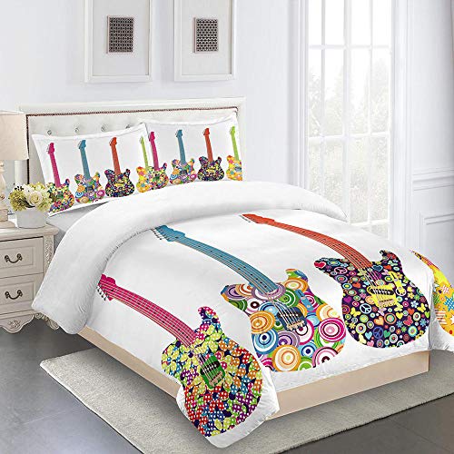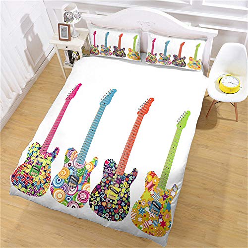 XOYKX - طقم غطاء لحاف مطبوع من اكس او واي كيه اكس - مقاس كينج 230 × 220 سم + 2 كيس وسادة ملون بتصميم جيتار موسيقي ابداعي سهل العناية وغطاء لحاف من المايكروفايبر الناعم مع سحاب اغلاق مكون من 3 قطع