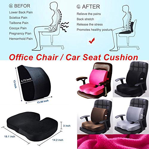- PREMIUM QUALITY! Our back support and coccyx pillow made of 100% pure high-density premium memory foam which create SOFT COMFORT & CARE and LONG LIFE for years and DOESN'T GO FLAT!Dimensions:Seat Cushion(46cm×36cm×7cm);Lumbar Support Pillow(34cm×33cm×12cm).