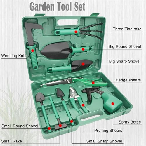 - 🌱【Package Includes】1x 3 tine rake, 1x big sharp shovel, 1x big round shovel, 1x pruning shear, 1x hedge shear, 1x spray bottle, 1x weeding knife,3 x mini garden tools(1 x small round shovel, 1 x small tip shovel, 1 x small rake, ), 1x carrying case.