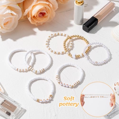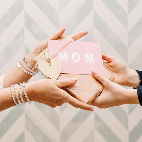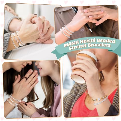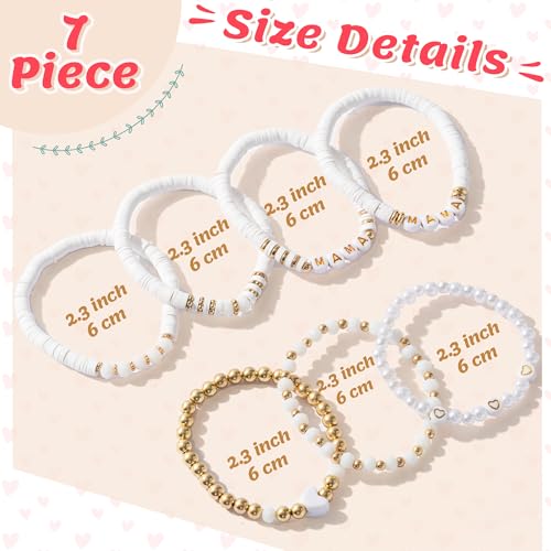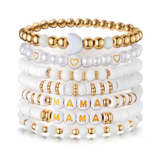 Y1tvei - Y1tvei 7Pcs Mama Gray Bracelets Set Wooden Stackable Heishi Polymer Clay Beaded Stretch Surfer Bracelet Dainty Gold Plated Beads Elastic Layering Bracelet Mama to Be Mother's Day Gifts for Mom