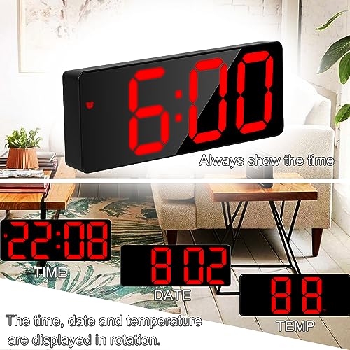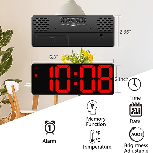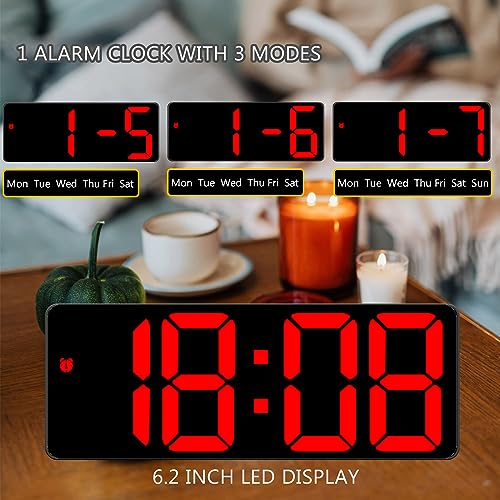 Yaboodn - Digital Alarm Clock for Bedrooms, 6.5 inch LED Display with Red Digits, 3 Levels Brightness Adjustable, Desk Alarm, Table Clock with 1 Alarm, 12/24H, Temperature, Calendar Corded Powered(Red)