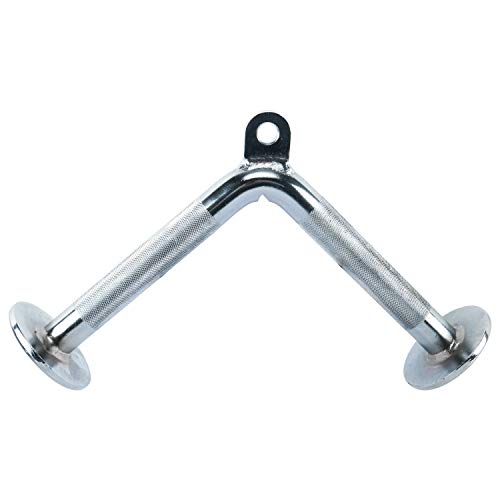 - 【V-shaped Bar】: Constructed of solid steel for more durability & shiny chrome finish for corrosion prevention; the knurling on handgrips is designed to provide a firm, non-slip grip even with sweaty hands while the flat knob ends keep your hands in place. Dimensions: 7” Long x 11.6” Wide x 1” Thick (Handle) x 0.56” Diameter hole. Weight Capacity: Up to 880 lbs.