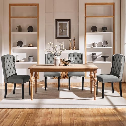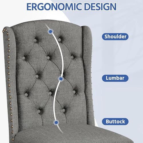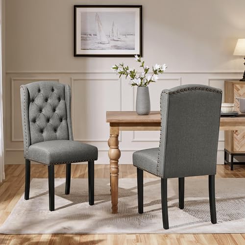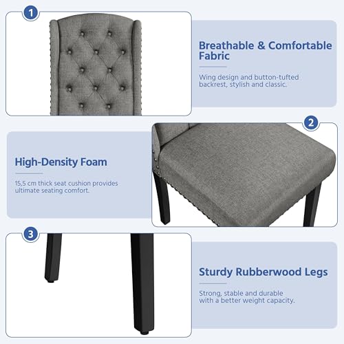 Yaheetech - كرسي طعام مصنوع من قماش بتأثير الكتان، طقم كراسي مطبخ بتصميم كلاسيكي مبطن بأزرار ومنجدة بأرجل من الخشب الصلب ومزينة بمسامير ذهبية من ياهيتك، لون رمادي فاتح، طقم من قطعتين