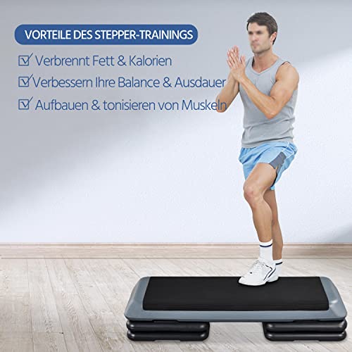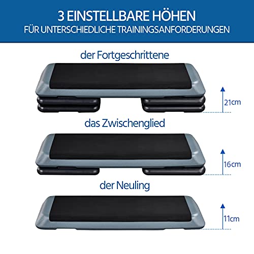 - Height Adjustable Our stepper offers you three different heights (11cm/16cm/21cm), allowing you to adjust the height of the platform to your needs and personal fitness level.
