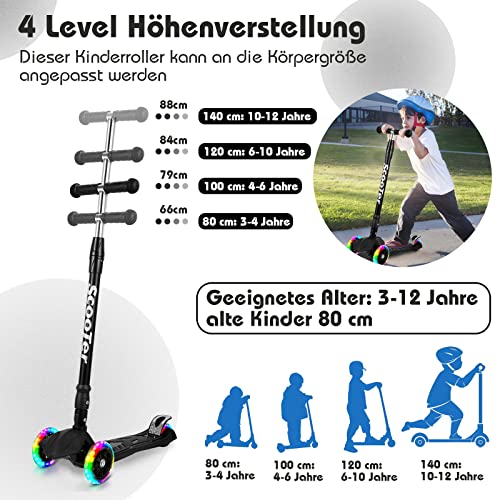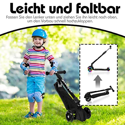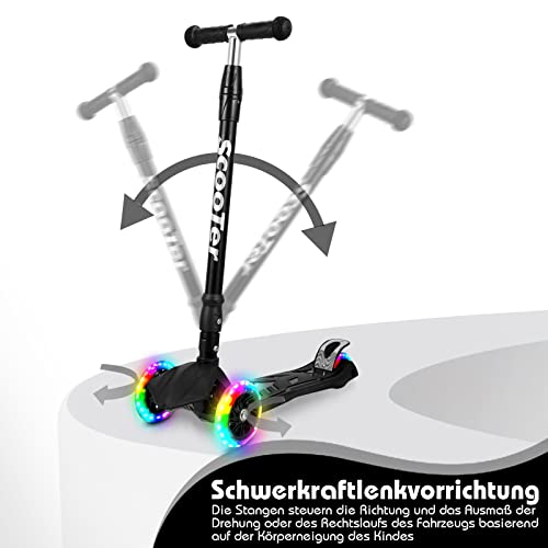 Yakimz - Children's Scooter, Tricycle Scooter with LED Luminous Wheels, Foldable City Scooter, 4 Height Adjustable, Gravity Steering Device, for Children from 3-14 Years, Black
