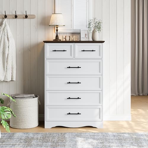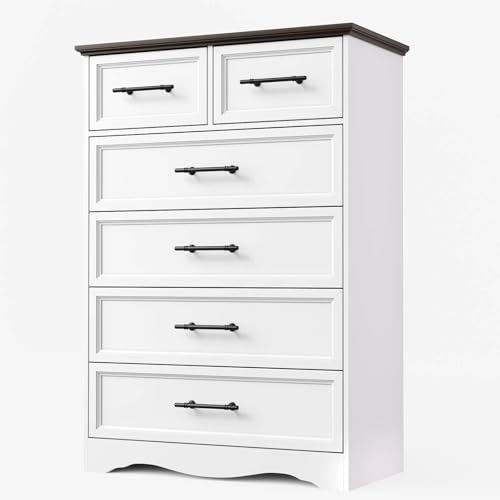 YANSNWO - خزانة ملابس بيضاء لغرفة النوم من يانسو، 6 ادراج، خزانة ادراج عصرية بطول 44 انش مع مقبض معدني مصقول، منظمات خزانة خشبية وخزانة تخزين لغرفة النوم وغرفة المعيشة