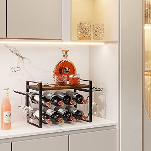 YAOHUOO - YAOHUOO JAFUSI Wine Rack with Glass Holder, Countertop Wine Rack Metal Frame, Wine Holder Stand with Wooden Tray, Bottles Rack for Home Decor Kitchen Storage (Hold 8 Bottles and 4~6 Glasses)