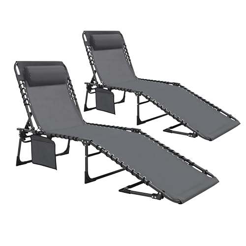 Yardenaler - كرسي استرخاء قابل للطي للاستخدام الخارجي مع وسادة وجيب قابل للفصل من ياردينالر، كرسي تسمير محمول مع 5 اوضاع خلفية قابلة للتعديل، للفناء والشاطئ والمسبح، لون رمادي