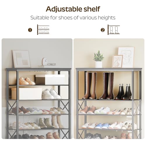 - Reliable Shoe Organizer: The shoe rack is built with quality particleboard and metal, strong and bearable. The top panel can undertake 44 lb and each mesh shelf 22 lb. The side X-shaped design of the metal shoe organizer offers doubled enhancement for overall stability