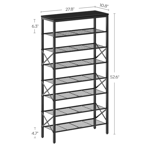 - Capacious Shoe Rack: The shoe rack sizes 27.8" x 10.8" x 52.6" and has 8 storage shelves. Each tier can hold 4 pairs of shoes, making it competent to store shoes of whole family. The top is ideal for placing bags, helmets and other belongings