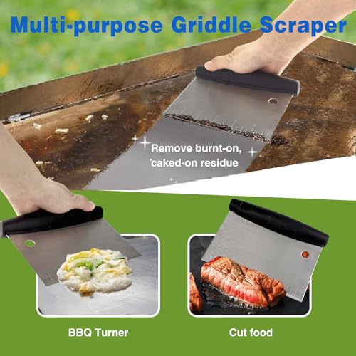 - Multipurpose Grill Scraper: Our bbq grill scraper is equipped with beveled edges. It is perfect for scraping surfaces to remove stuck - on food residues. And it can also be used for cutting dough, such as pizza dough, pastry dough, bread dough, as well as for slicing vegetables, flipping food. This is a must have as griddle grill accessories for your home kitchen backyard party or cookouts barbecue.